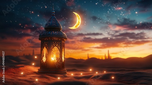 Ramadan Kareem - Arabic Lantern At Night In desert With Crescent Moon And Magic Glittering - Eid Ul Fitr with generative ai
