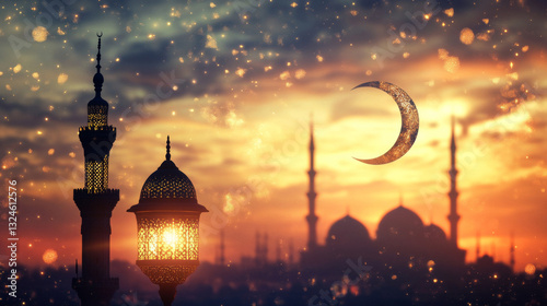 Ramadan Kareem – An Arabic lantern glows beside a crescent moon, with a softly blurred mosque in the background at sunset, accentuated by twinkling bokeh lights