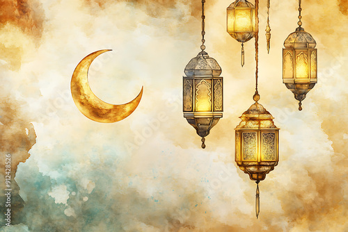 Ramadan kareem or ramazan mubarak greeting with fanous or lantern and crescent on cloud. Islam month of fasting. Background for arabic holiday sign or poster. Eid al-fitr and al-adha. Religion theme