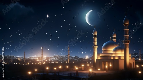 Ramadan Kareem's background with mosque and moon. 3d rendering