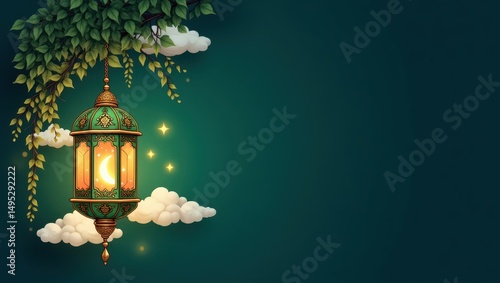Ramadan Lantern Hanging from Branch: Green Teal Background with Crescent Moon
