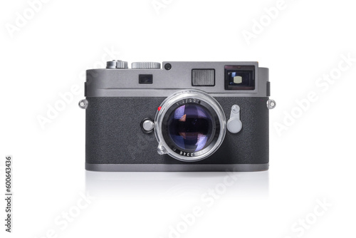 RANGEFINDER photo camera with lens in isolated on white background. vintage camera technology and photography.