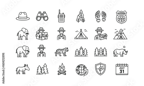 Ranger and wildlife conservation line icon set. Safari, nature, and outdoor exploration symbols. Vector pictograms for graphic design.