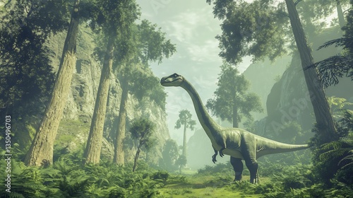 Rare Europasaurus moving cautiously through lush valley small yet graceful form blending into prehistoric landscape The towering trees around it sway gently in the breeze adding to the tranquil scene