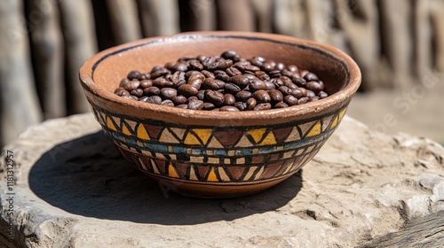 Rare Mocha beans from Yemen, known for their distinct round shape, displayed in a traditional bowl with tasting notes about their heritage