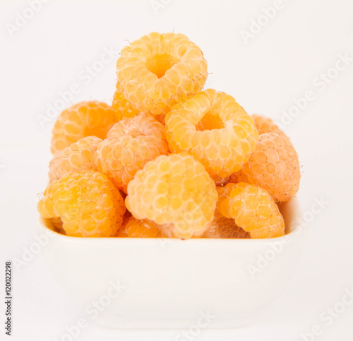 Raspberries: a bowl of fruit on white background