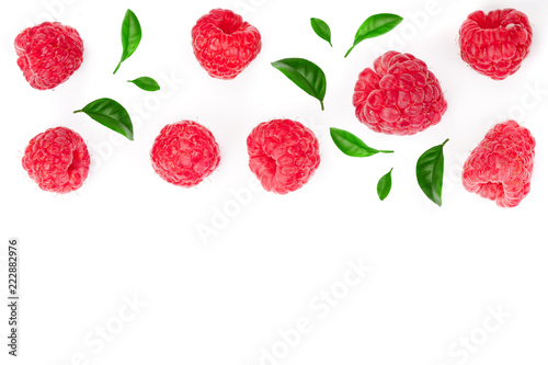 raspberries with leaves isolated on white background with copy space for your text. Top view. Flat lay pattern