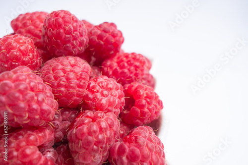 Raspberry berries close-up. fresh raspberries in a white cup on a white background. View from above. Soft focus.