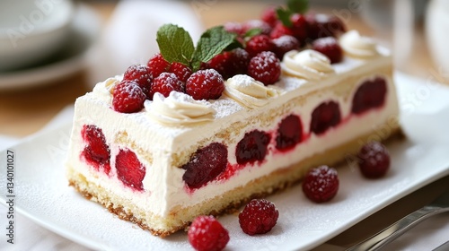 Raspberry cake decorated with mint leaves on a white plate, close up. Great for food blogs, recipe sites, or to illustrate sweet treats.