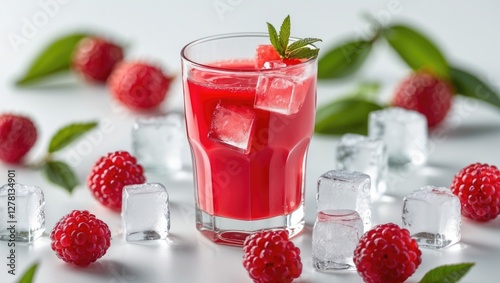 Raspberry cocktail on a table with fresh raspberries ice cubes and mint leaves against a light background