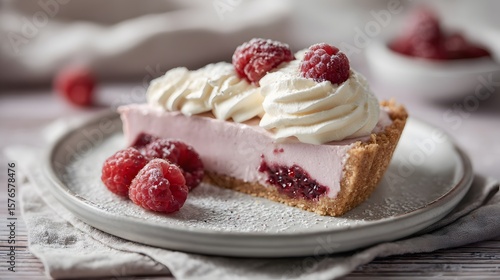 Raspberry cream pie slice with whipped topping and powdered sugar on ceramic plate.