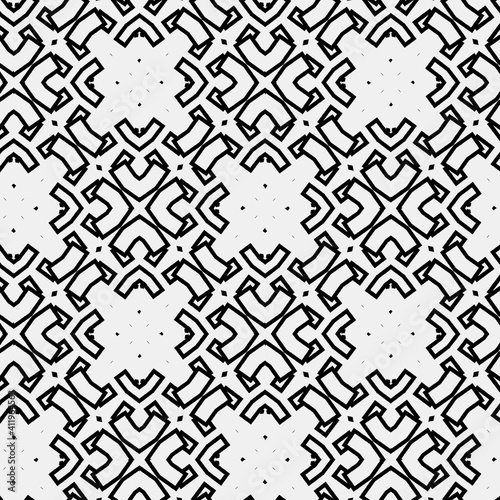 Raster geometric ornament. Black and white seamless pattern with star shapes, squares, diamonds, grid, floral silhouettes. Simple monochrome ornamental background. Repeat design for decor, print