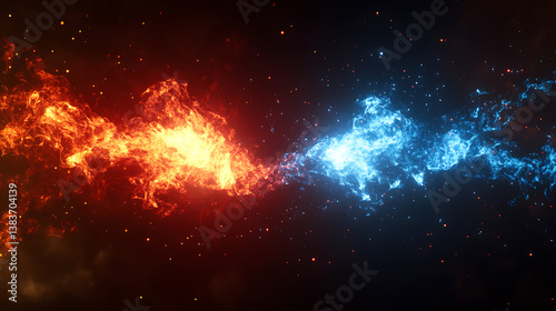 Raster illustration of abstract flashes of red and blue flames, ignition, fire element, flames, fakir, gas, gasoline, chemical experiments, futurism concept, 3d artwork rendering design