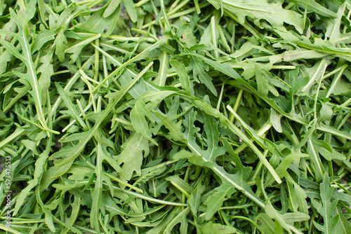 Raw and fresh arugula, green leaves, from above. Top view on salad vegetable and decorative garnish. Surface and background, food photo.