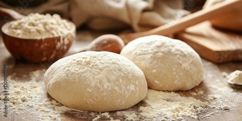 Raw bread dough balls on a wooden table surrounded by flour and a bowl of flour with a wooden spoon highlighting earthy tones and textures.