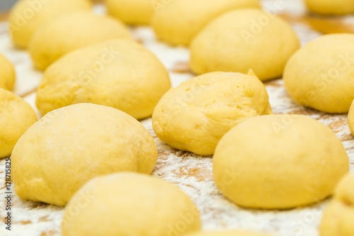 Raw donuts lying in flour on wooden table