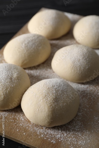Raw dough balls with flour on table, closeup
