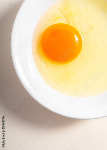 Raw eggs. Close up. flat lay raw eggs yolk in bowl. Isolated broken white background.