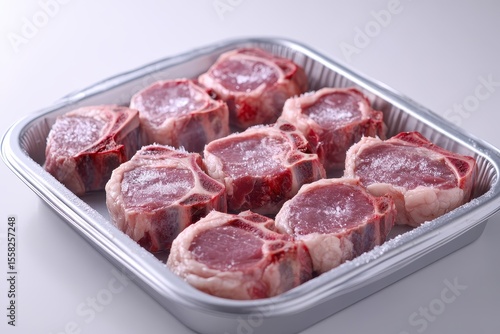 Raw lamb chops are arranged in a foil tray, ready for cooking process. It can illustrate butcher, meat sales, or gourmet cooking concepts.