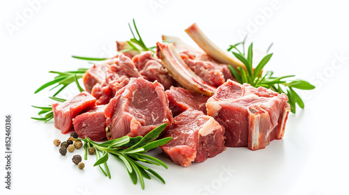 Raw lamb chops on a white background, garnished with rosemary and peppercorns, perfect for recipes, menus, or food blogs seeking high-quality, appetizing meat imagery