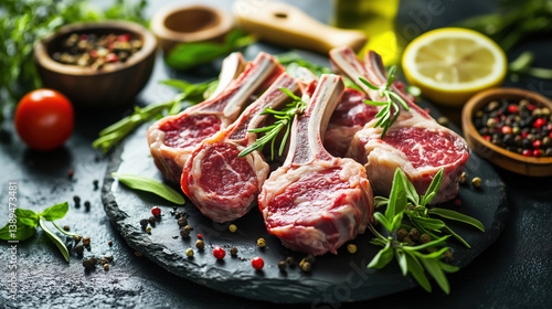 Raw lamb chops with herbs and spices on slate plate