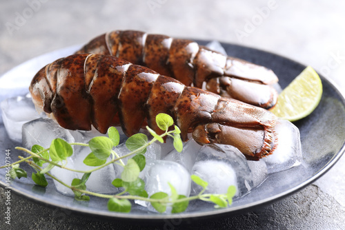 Raw lobster tails with microgreens, lime and ice on table, closeup
