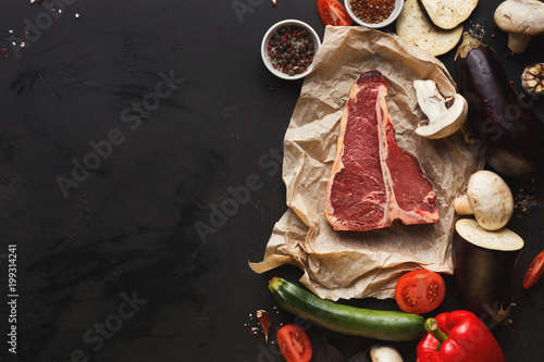 Raw t-bone steak with vegetables on parchment