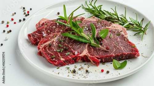 Raw tri-tip steak with herbs and spices on a white plate, ready to cook, isolated