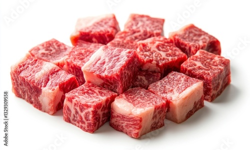 Raw Wagyu Beef Cubes Ready for Cooking on White Background