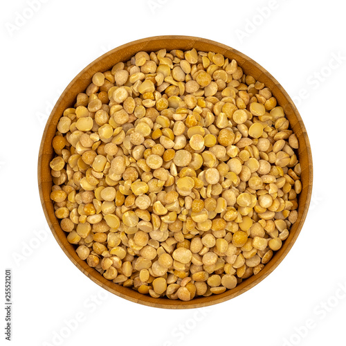 Raw yellow split peas in a wooden plate (bowl) isolated on white background, top down view