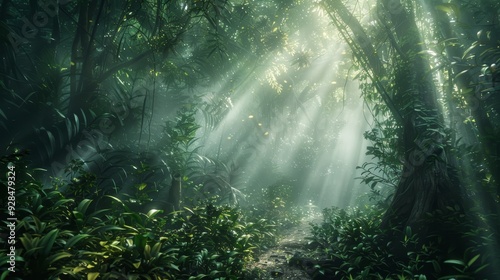 Rays of sunlight break through the forest canopy, illuminating a moss-covered trail in a tranquil, green woodland.