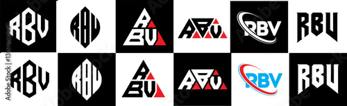 RBV letter logo design in six style. RBV polygon, circle, triangle, hexagon, flat and simple style with black and white color variation letter logo set in one artboard. RBV minimalist and classic logo