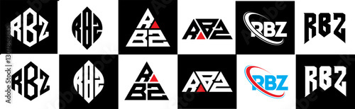 RBZ letter logo design in six style. RBZ polygon, circle, triangle, hexagon, flat and simple style with black and white color variation letter logo set in one artboard. RBZ minimalist and classic logo