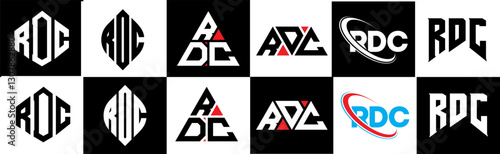 RDC letter logo design in six style. RDC polygon, circle, triangle, hexagon, flat and simple style with black and white color variation letter logo set in one artboard. RDC minimalist and classic logo