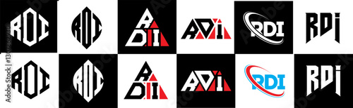 RDI letter logo design in six style. RDI polygon, circle, triangle, hexagon, flat and simple style with black and white color variation letter logo set in one artboard. RDI minimalist and classic logo