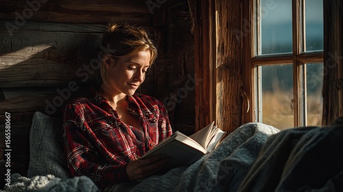 Reading a book in a cozy wooden cabin at home brings peace and quiet. It's a relaxing and eco-friendly escape.