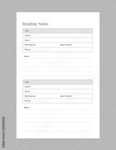 Reading Notes Planner. Minimalist planner template set. Vector illustration.