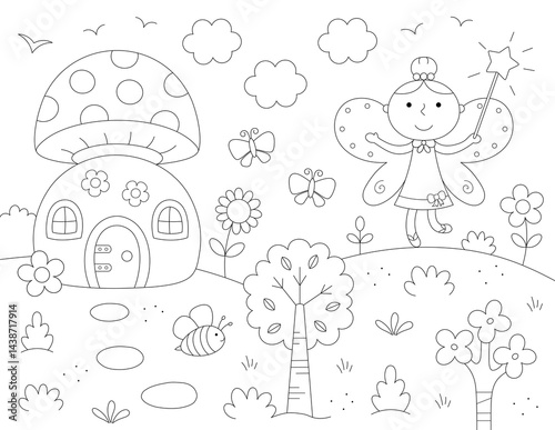 ready to print in 8.5 x 11 inch letter size paper. Coloring page with an outline drawing of a fairy girl-themed cartoon scene.