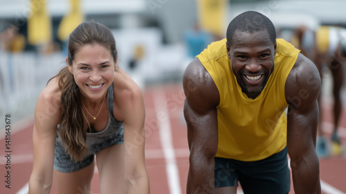 Ready to Race: A dynamic duo poised at the starting line of a track, exuding determination, excitement and an unyielding competitive spirit, ready to race to success