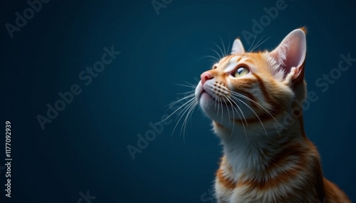 Real cat gazing upwards with soft fur on dark blue background, nature, calm scene