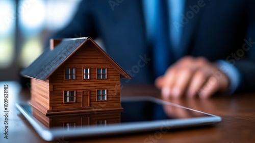 Real estate agent showcasing foreclosed home listings on tablet. Concept, banner with copy space
