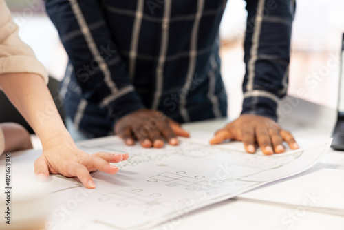 Real estate experts analyzing the layout of the high class office, evaluating important architecture details to potential client. Agents meeting and reviewing property blueprints. Close up.