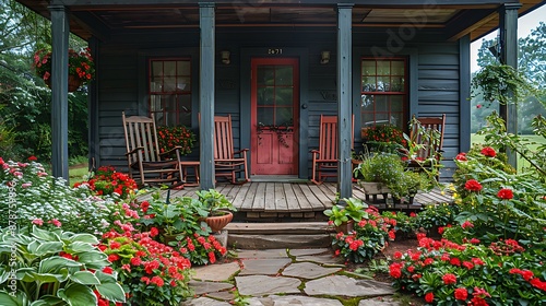 Real estate focusing a cozy Cottage with a flowerfilled garden a stone pathway and a wooden porch with rocking chairs in a rural setting