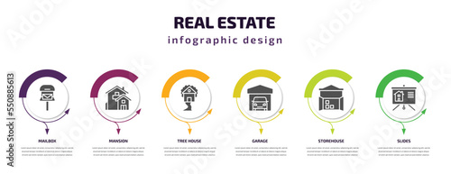 real estate infographic element with filled icons and 6 step or option. real estate icons such as mailbox, mansion, tree house, garage, storehouse, slides vector. can be used for banner, info graph,