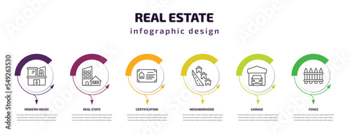 real estate infographic template with icons and 6 step or option. real estate icons such as modern house, real state, certification, neighborhood, garage, fence vector. can be used for banner, info