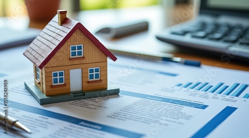 real estate investment checklist document concept. Model house on financial documents with a laptop in the background.