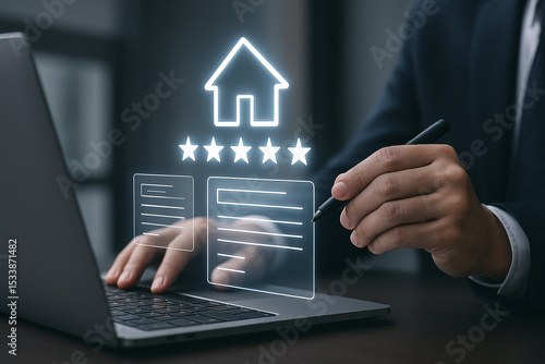 Real estate online review with five stars rating and property documents on laptop screen concept view