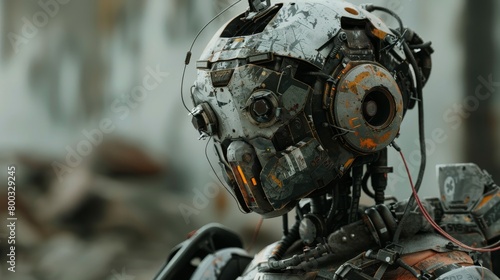 Realism style 3D Modeling of a robotic soldier, shown in gritty, rustic combat gear, in a harsh, shadowed battlefield setting