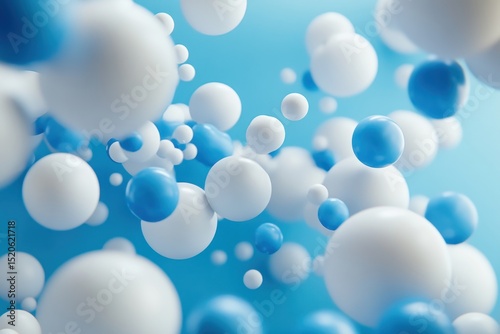 Realistic 3D render of white and blue balloons, soft bounce as they descend