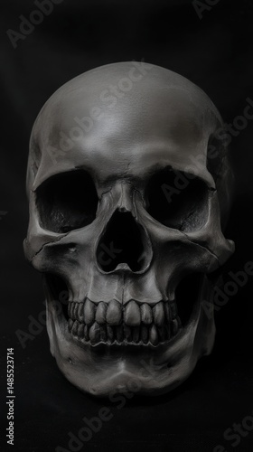 Realistic black skull displayed against a dark background, highlighting intricate details and textures of the human anatomy